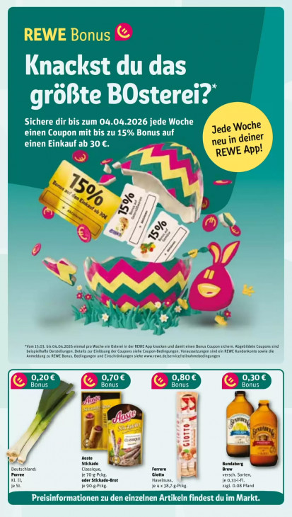 Bitte beachten Sie, dass dieser Text automatisch generiert wird und möglicherweise Fehler enthältREWE Bonus [a Knackst du das größte BOsterei? Sichere dir bis zum 04.04.2026 jede Woche Jede Woche einen Coupon mit bis zu 15% Bonus auf einen Einkauf ab 30 €. neu in deiner REWE App! & 759 ne os % 5 AY ur 5 md >Ÿ *Vom 15.03. bis 04.04.2026 einmal pro Woche ein Osterei in der REWE App knacken und damit einen Bonus Coupon sichern. Abgebildete Coupons sind beispielhafte Darstellungen. Details zur Einlösung der Coupons siehe Coupon-Bedingungen. Voraussetzungen sind ein REWE Kundenkonto sowie die ‚Anmeldung zu REWE Bonus. Bedingungen und Einschränkungen siehe www.rewe.de/service/teilnahmebedingungen 0,20 € EINE _ yrm d F \ IM = f À hed) 7 1 # = \ > dl 2. Aoste Ga sm N Stickado 2 an Bundaberg | Deutschland: Classique, Ferrero Brew Porree je 70-g-Pckg. Giotto 5 versch. Sorten, KL IL, oder Stickado-Brot Haselnuss, je 0,33-L-FL. je St. je 90-g-Pckg. je 4 x 38,7-g-Pckg. zzgl. 0.08 Pfand Preisinformationen zu den einzelnen Artikeln findest du im Markt.