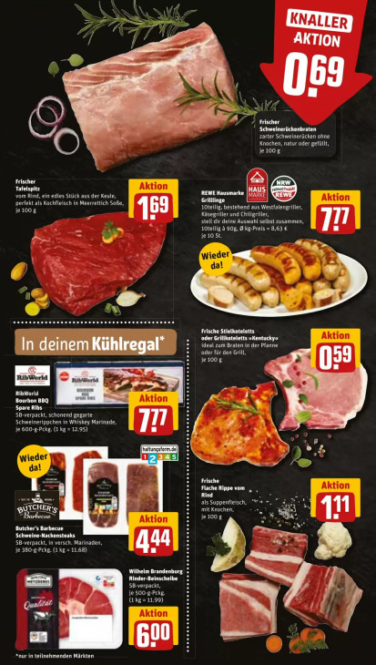 Bitte beachten Sie, dass dieser Text automatisch generiert wird und möglicherweise Fehler enthältIN IN 4 I: 5 / / AKTION == ON kn 69 =. m IN N 4 Pan ij À ht uf ta IE ( Schweinerückenbraten zarter Schweinerücken ohne Knochen, natur oder gefüllt, je 100 g Frischer 23 Tafelspitz Himat Pros vom Rind, ein edles Stück aus der Keule, REWE Hausmarke [MARKE perfekt als Kochfleisch in Meerrettich Soße, Grilllinge 69 10teilig, bestehend aus Westfalengriller, je100g - Käsegriller und Chiligriller, r stell dir deine Auswahl selbst zusammen, 11 10teilig à 90g, kg-Preis = 8,63 € je 10 St. En Te 2 5 Zn, u 5 Od ssl N De E EEE EERE EE) Frische Stielkoteletts ‚oder Grillkoteletts »Kentucky« ideal zum Braten in der Pfanne BEEN EN oder für den Grill, ag B. je100g 59 en ben ®, RibWorld Bourbon BBQ = je Spare Ribs SB-verpackt, schonend gegarte Schweinerippchen in Whiskey Marinade, 171 je 600-g-Pckg. (1 kg = 12.95) Aa kr; haltungsform.de} se À x 4 UT | Flache Rippe vom B 5 PE Rind | als Suppenfleisch, Re mit Knochen, U | je 100 8 a Butcher’s Barbecue Schweine-Nackensteaks SB-verpackt, in versch. Marinaden, LME je 380-g-Pckg. (1 kg = 11.68) JEU N; Wilhelm Brandenburg Rinder-Beinscheibe SB-verpackt, 7 je 500-g-Pckg. pe 74 (1 kg = 11.99) 4 r ‚id | m Ce A CCE EEE EEE ETES TELE EEE ETES CEST ETES ESS IEEE ETES TE EEE ET TT ET ITT TEE TEE ITS > *nur in teilnehmenden Märkten
