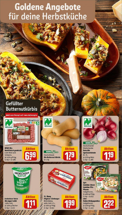 Bitte beachten Sie, dass dieser Text automatisch generiert wird und möglicherweise Fehler enthältnn Goldene Angebote ë _ für deine dr x to ai et m 7. hN Er 4 L D in a r Ss By N AN HN VOB à 7 1 PA a, Ki Ee CA F 1 Li "a te SS hi S A kans” Ne Mn FR ed Ke © A Ya N ar _ Ya 2 & Pie: Sn \ Fa % Gefüllter 4 Butternutkürbis FR Jetzt zum Rezept auf rewe.de/rezepte a) LA LR PP x re Naturland | Naturland Naturland \ Ed = k | 7 | Bar MET HO Deutschland) REWE Bio Niederlande: Hackfleisch gemischt Rote Bio vam Rind und Schwein, ES; Deutschland: Speisezwiebeln KL. II, je 400-g-Pckg. Bio Butternut Kürbis 13 je 500-g-Netz (1 kg= 17.48) jeikg (Ike = = 2.38) CE, vn ANDECHSER = = a Me 4 N ATU TA Kn Ne mt rt: | Iglo 4 ‚Gemüse-Pilz- ‚Gemüse-Ideen Ba ei Re Pfanne tiefgefroren, — ck Je 480-g-Pckg. St.M; (kg = 4.63) Andechser Natur ‚Allgäuer Limburger oder 3,8% Fett, Bio Jogurt mild Weichkäse, 40% Fett iTr. Rahm-Königsgemüse tiefgefroren, je 500-g-Becher je 200-g-Pckg. je 500-g-Pckg. (ikg= = u) (rg 95) (Lkg= 4.44) a br 4