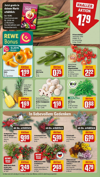 Bitte beachten Sie, dass dieser Text automatisch generiert wird und möglicherweise Fehler enthältæ Niva de: UI] deinem Markt bf erhältlich: Der REWE Familienkalender a für 2026 mit u 12 Rezepten, Stundenplänen und | se Ferienübersicht. pr 0 Prinzessbohnen Ursprung: siehe REWE Ae Etikett, KLI, Z 5 je 200-g-Pckg. Bonus (kg = 895) LS 4 7 Tee = Er m Er on 29 "à PR | de A 2 Niederlande: = = 74 Mini Cherry Rispentomaten Spanien/Italien: Spanien: »SlBe Versuchung, Kakis Mini Gurke a9 Kl. Extra, [ KLI, | KILL, je 200-g-Schale je 1-kg-Schate jest. (I kg= 11.10) EE nl Costa Ricaf BIO Honduras: sem Ananas Extra Sweet 7 KN KLI, à Je St. EN Se 4 0 À 134 Deutschland} EE S;0 Niederlande/Polen: Italien: Weiße Champignons Bio Rucola [a KL, KL II, Le || 1 | je 400-g-Schale je 80-g-Schale l (Lkg = 3.98) {1 kg = 1100) — a Ve {a [HAL m LA hen EN ER: ‘ab Do. ETE LE Do. erhältlich ab Do erhältlich Grabgesteck Mens oder Grableger! Umenhandstraußt ‚Grabstraußt versch, Farben und C versch. Farben und versch. Farben Dekore, Dekore, und Dekore, je st, jest. jest, m. a u in Oes a, = EN: NES NTS 2% +) \ ete A > en AT wg || SZ el AN onb V4 Blumenstrauß “ REWE Beste Wahl »Chrysanthemen mit Scheinbeeret Santiniu REWE Beste Wahl für die versch. Farben, |t Azalee oder Lt | AuBendekoration, mit | [| mit Floralife Grünpflanze: vielen roten Beeren, Schnittblumennahring, je Topf Es B je Bund je Topf tArtikelsind nicht ständig im sanat states pek htc Abdung bath